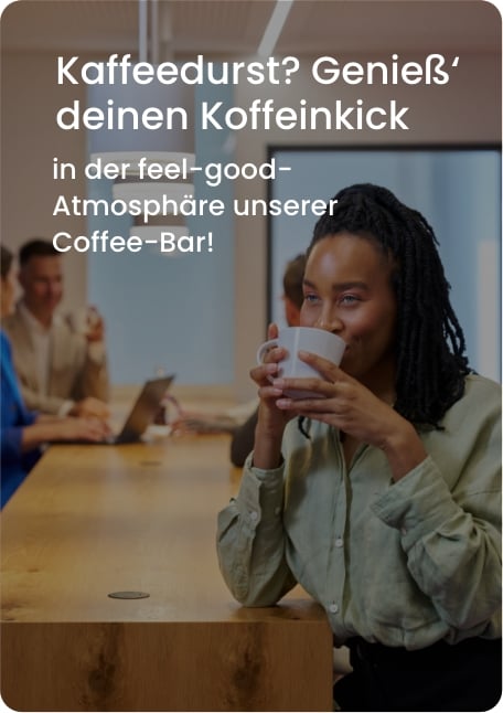 Zur Premium-Ausstattung gehören bei uns übrigens nicht nur Designmöbel und modernste Technik, sondern auch Bereiche zum Relaxen und Netzwerken. Zum Beispiel: unsere einladende Business Lounge, die beliebte Coffee-Bar und gemütliche Teeküchen.